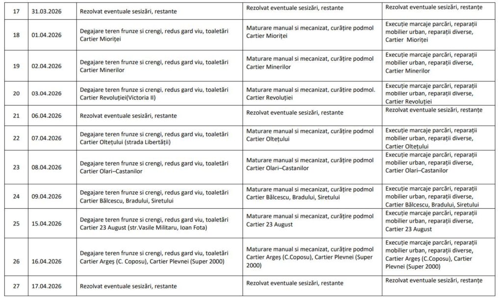 „Echipele Edilitara Public S.A. – din sectoarele de salubrizare, spații verzi, reparații, mecanizare și celelalte servicii operative – se vor deplasa în cartierele orașului conform graficului stabilit pentru: curățenie generală, igienizarea spațiilor verzi, întreținerea domeniului public, ridicarea deșeurilor abandonate.