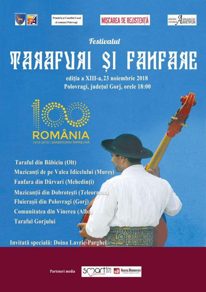 Şcoala Populară de Artă din Târgu-Jiu, alături de Consiliul Județean Gorj, Primăria şi Consiliul Local Polovragi, Asociaţia Culturală “Arhetipuri: Datini, Muzică, Rost” şi Asociaţia Mişcarea de Rezistenţă organizează vineri, 23 noiembrie 2018, începând cu ora 18.00, la Polovragi, Festivalul Tarafuri şi Fanfare, ediţia a XIII-a.