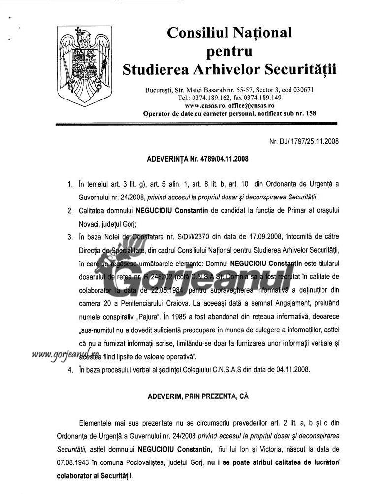 În anul 2008, dar și în 2012, la fotoliul de primar, ocupat și în prezent de către primarul PNL, Dumitru Leuștean, a candidat și Constantin Negucioiu. Respectivul era, cel puțin la ultima încercare, membru al partidului lui Talpeș, mai exact al Uniunii Populare Social Creștine(UPSC). Negucioiu, în prezent cnsas1pensionar, a pierdut și prima și a doua oară alegerile, dar a intrat, cu această ocazie, măcar în atenția Consiliului Național pentru Studierea Arhivelor Securității(CNSAS). Acest organism dezvăluie astfel că cnsas 2Negucioiu este titularul unui dosar fond de rețea că nr. R248202(cotă CNSAS). Mai exact, CNSAS susține că rspectivul a fost recrutat în calitate de colaborator, la data de 22 mai 1984, pentru supravegherea informativă a deținuților din camera 20 a Penitenciarului Craiova.  “La acea dată a semnat un Angajament, preluând numele conspirativ «Pajura». În 1985 acesta a fost abandonat din rețeaua informativă”, transmite CNSAS și asta deoarece respectivul nu ar fi dovedit suficientă preocupare în munca de culegere a informațiilor, astfel că nu a furnizat informații scrise, limitându-se doar la furnizarea unor informații verbale, și acestea fiind lipsite de valoare operativă. “Pajura”, acum în vârstă de 73 de ani, nu a primit însă calitatea de colaborator al fostei Securități, CNSAS considerând că novăceanul nu a făcut poliție politică.