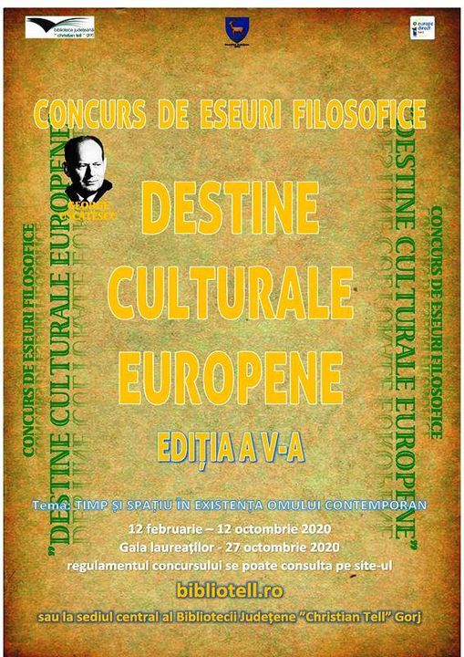 Concursul de eseuri ,,Destine culturale europene” este organizat de Biblioteca Județeană ,,Christian Tell” Gorj și Centrul de Informare Europe Direct Gorj și se adresează elevilor de la liceele și colegiile din Gorj, având ca scop constituirea unui cadru deopotrivă formal și nonformal de consolidare a cunoștințelor și intereselor culturale și științifice ale acestora. Tema acestei ediții a concursului este ,,Timp și spațiu în existența omului contemporan” și se constituie ca un impuls către realizarea unui eseu de factură filosofică, având ca bază de reflecție următorul fragment: ,,Epoca actuală ar fi, poate, mai curând epoca spaţiului. Suntem în epoca simultanului, a juxtapunerii, a aproapelui şi departelui, a alăturatului, a dispersatului. Ne aflăm într-un moment în care lumea se percepe pe sine mai puţin, cred, ca o mare viaţă care s-ar dezvolta în timp, cât ca o reţea ce leagă puncte şi îşi urzeşte labirintul.” (Michel Foucault, Theatrum Philosophicum, Casa Cărţii de Ştiinţă, 2001, p.251). Lucrările trebuie să fie redactate în format Word, font Times New Roman, corp 12, la un rând, cu un număr minim de 3 pagini și maxim de 6 pagini / A4, trebuie să fie originale și să aibă un singur autor. Câștigătorii vor fi desemnați de un juriu format din specialiști în literatură, istorie și filosofie. ,,Întrucât abordările sunt direcționate numai spre dimensiunile tematice sugerate, în evaluarea materialelor vor fi aplicate criterii de analiză standard a eseurilor filosofice, urmărind preponderent: claritatea exprimării, respectarea temei, folosirea creativă a limbii, originalitatea poziției prezentate, creativitatea travaliului filosofic”, se precizează în regulamentul concursului. Gala Laureaților va avea loc pe 27 octombrie 2020 (Ziua sărbătoririi inaugurării Coloanei fără sfârșit). Vor fi acordate premii în valoare totală de 1000 de lei, oferite de Biblioteca Județeană ,,Christian Tell” Gorj și Centrul Europe Direct Gorj. Patronul spiritual al concursului este filosoful George Uscătescu (n. 5 mai 1919, Crețești, Gorj – d. 11 mai 1995, Madrid), filosof, estetician, eseist, poet și sociolog român, membru de onoare din străinătate al Academiei Române de la 10 septembrie 1991, inițiatorul revistei ,,Destin”. 2020 este anul în care se împlinesc 101 de ani de la nașterea filosofului gorjean care a trăit și creat o bună parte din viață în Spania, în exil, așa cum au făcut și unii alți mari oameni de cultură români în diverse țări, în afara lagărului comunist: Mircea Eliade, Constantin Virgil Gheorghiu, Vintilă Horia, Aron Cotruş, Pamfil Şeicaru, Emil Cioran, Horia Stamatu, Monica Lovinescu, Virgil Ierunca, Ştefan Baciu, Alexandru şi George Ciorănescu ș.a.m.d..