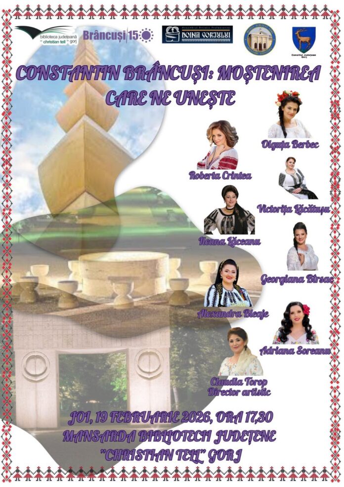 Pe 19 februarie 2026, Târgu Jiu devine, mai mult ca oricând, un spațiu al întâlnirii cu moștenirea artistică lăsată de Constantin Brâncuși, printr-o serie de evenimente culturale care aduc împreună arta plastică, muzica, tradiția și memoria locului.
