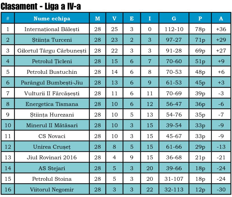 Cu două runde înainte de finalul campionatului judeţean, Băleştiul se poate pregăti deja pentru barajul ce duce spre Liga a 3-a. Elevii lui Dan Vasilică sunt oficiali campionii Gorjului, într-un sezon la capătul căruia au şanse mari să nu cunoască înfrângerea. Liderul a dominat la toate capitolele Liga a 4-a, iar, după 28 de runde, Băleştiul are cea mai bună apărare şi cel mai bun atac. Internaţional, echipă care a fost aproape de a întâlni o formaţie de Liga 1 în Cupa României, este un exemplu că prin muncă se poate realiza aproape orice. Mulţi nu le dau şanse să evolueze în cel de-al treilea eşalon al fotbalului românesc, dar poate că aşa este mai bine! Asta pentru că echipa din Băleşti ne-a obişnuit să le dea peste nas cârtitorilor. Multă baftă!