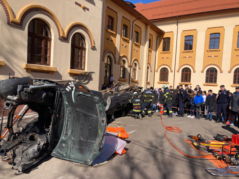 Pompierii militari au intervenit ieri, la prânz, la un accident rutier produs în curtea unui liceu din municipiu, totul făcând parte dintr-un exercițiu menit să stârnească interesul elevilor pentru a ști cum să se comporte în cazul unor astfel de situații reale.