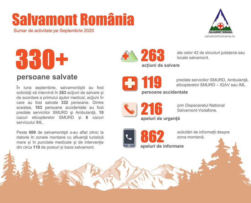 Luna septembrie, luna de final a sezonului de vară, a fost caracterizată ca o perioadă cu activitate turistică intensă, cu un număr foarte mare de turiști pe munte, fapt ce a impus asigurarea asistenței de salvare montană la un nivel ridicat, zilnic, un număr de circa 600 de salvamontiști aflându-se la datorie în zonele montane cu afluență turistică mare, în zonele de practicare intensivă a sporturilor montane, în punctele medicale și de intervenție din cca 100 de posturi și baze salvamont. În această perioadă salvamontiștii au fost solicitați să intervină în 263 de acțiuni de salvare și de acordare a primului ajutor medical, acțiuni în care au fost salvate 332 de persoane. Dintre acestea, 103 persoane accidentate au fost predate serviciilor SMURD sau de Ambulanță, iar, 10 persoane, elicopterelor de salvare SMURD-IGAV. Din păcate, șase persoane au decedat pe munte, sarcina salvamontiștilor reducându-se la recuperarea acestora și transportul pentru predarea la serviciile IML. Prin Dispeceratul Național Salvamont-Vodafone au fost primite, direct, 216 apeluri prin care anunțau accidente montane, restul apelurilor de urgență fiind primite și preluate direct de către salvamontiști prin Serviciul Unic de Urgență 112 sau prin dispeceratele locale ale echipelor salvamont. De asemenea, în cursul lunii septembrie s-au primit 1.421 apeluri prin care solicitau informații despre zona montană, dintre acestea, 862 de apeluri au fost înregistrate la Dispeceratul Național Salvamont-Vodafone, restul de 559 apeluri fiind făcute direct structurilor salvamont locale sau județene.