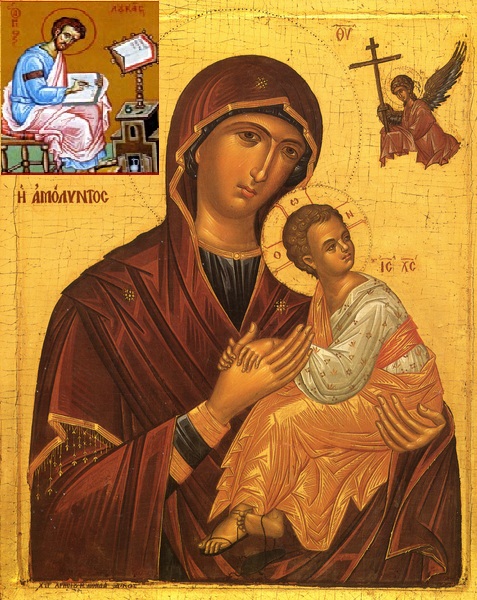 Se spune despre Sfântul Apostol și Evanghelist Luca faptul că el este cel care a pictat prima icoană a Maicii Domnului zisă «Povățuitoarea» (sau „arătătoarea drumului” – gr. Hodigitria), menționată în Paraclisul Maicii Domnului: ,,Mută să fie gura păgânilor, Care nu se închină cinstitei icoanei tale, Celei zugrăvite de sfântul Apostol și Evanghelist Luca, Ceea ce se cheamă Povățuitoare”! Apoi, a zugrăvit și alte două icoane ale Preasfintei Născătoare de Dumnezeu și le-a adus la Maica Domnului, spre a vedea dacă îi vor plăcea; iar ea, văzând acele chipuri ale sale, a grăit astfel: ,,Darul Celui ce S-a născut din mine și al meu să fie cu icoanele acestea!, pentru că Sfântul Apostol și Evanghelist Luca a mai zugrăvit pe lemn și chipurile sfinților și marilor Apostoli Petru şi Pavel, și de la dânsul s-a început în toată lumea zugrăvirea sfintelor icoane, întru slava lui Dumnezeu, a Maicii Lui și a tuturor sfinților, pentru împodobirea Bisericii și spre mântuirea credincioșilor, celor ce cu dreaptă credință cinstesc sfintele icoane. Sfânta Tradiție consemnează astfel drept primul iconograf pe Sfântul Evanghelist Luca. În țara noastră, icoana Născătoarea de Dumnezeu cu Pruncul de la Mănăstirea Nămăiești este, după Tradiție, una din cele zugrăvite de Sfântul Luca. În Grecia, cea de la Mănăstirea Soumela, Mega Spilaio și mai apoi Panagia Kikkou, din Cipru, sunt considerate ca fiind pictate de tot de dânsul. Sfântul Apostol și Evanghelist Luca poate fi reprezentat în mai multe feluri. El apare ca un tânăr cu părul creț, având barbă rară și susținând la pieptul său Sfânta Evanghelie. Himationul (mantie amplă purtată de greci, prinsă cu o agrafă pe piept sau pe umăr.) său este în general colorat în nuanțe de roșu, în vreme ce tunica (haină bărbătească (de uniformă), de obicei încheiată până la gât și care se poartă peste cămașă) poate fi verde închis sau albastru. În miniaturi se poate vedea purtând veșminte zugrăvite în albastru și violet. Unele icoane ni-l înfățișează stând ghemuit pe un scaun și pictând icoana Maicii Domnului sau scriindu-și Evanghelia, pe a cărei filă deschisă se citesc următoarele: ,,Deoarece mulți s-au încercat să alcătuiască o istorisire despre faptele deplin adeverite între noi…”, în jurul său se evidențiază un peisaj citadin (case, ziduri, baldachin), elemente definitorii ce pot fi vizualizate și în pandantivul cupolei Pantocratorului. Alături de el este pictat simbolul său, care este vițelul. Acest detaliu, cea de-a treia figură simbolică menționată în Iezechiel (1, 10), este un simbol al rangului sacrificial și preoțesc ale lui Hristos, așa cum sunt ele menționate de Sfântul Irineu. Chipul său mai apare redat în registrul Sfinţilor Apostoli de pe iconostas, precum și pe Ușile Împărătești împreună cu ceilalți Sfinți Evangheliști: Matei, Marcu, Ioan, încadrând scena Bunei Vestiri. Mormântul Sfântului Apostol Luca a fost descoperit încă de timpuriu de către creștinii dreptmăritori. Se spune că în locul unde a fost îngropat ploua cu colirie, apă care vindeca bolile de ochi, aceasta fiind și o mărturie a profesiei pe care sfântul a exercitat-o în timpul vieții. Moaștele sale făcătoare de minuni sunt mutate de la Teba la Constantinopol în timpul împăratului Constanțiu (357), fiul Sfântului Constantin cel Mare și depuse în Biserica Sfinților Apostoli, unde au fost îngropate sub sfânta masă. Acolo mai erau îngropați și Sfinții Apostoli Andrei și Timotei. În timpul împăratului Iustinian I moaștele sale sunt transferate în Biserica Sfinților Apostoli zidită de Iustinian, iar capul sfântului Luca este adus la Roma de sfântul Grigorie cel Mare la sfârșitul secolului al VI-lea. În 1204, cruciații celei de-a IV-a Cruciade fură moaștele Sfântul Apostol și Evanghelist Luca de la Constantinopol și le aduc la Padova (Italia), unde se găsesc și acum, în biserica Santa Justina din centrul acestui oraș. În 1992, mitropolitul Ieromin de Tebei și Livadia (devenit Arhiepiscop al Bisericii Greciei) a cerut Bisericii Romano-Catolice un fragment semnificativ din moaștele Sfântului Luca, pentru a fi puse la închinare acolo unde se găsește mormântul sfântului evanghelist și unde este cinstit astăzi! Episcopul romano-catolic de Padova a dăruit mitropolitului Ieronim coasta de lângă inimă din moaștele sfântului Luca pentru a fi păstrată și venerată la mormântul sfântului din Tebatomb in Thebes, Grecia. Mâna dreaptă a Sfântului Evanghelist Luca, cu care a scris Evanghelia se află la Mănăstirea Dionisiu din Sfântul Munte Athos. Sfântul Apostol și Evanghelist Luca a fost primul iconograf, la pictarea Preasfintei Născătoare de Dumnezeu!