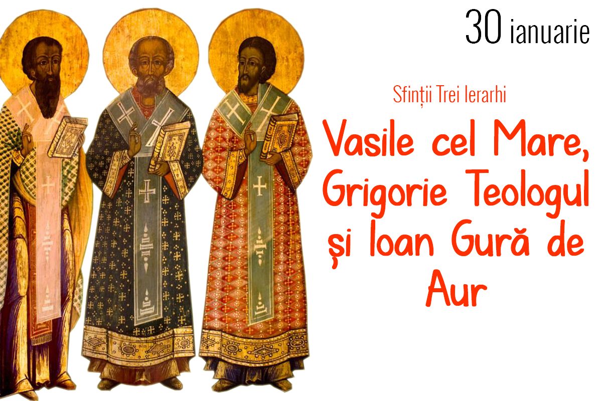 Sfinţii Trei Ierarhi: Vasile cel Mare, Grigorie Teologul şi Ioan Gură de Aur, care sunt sărbătoriţi astăzi, 30 ianuarie, au vieţuit în Asia Mică, în secolele al IV-lea şi al V-lea, într-o perioadă aflată încă sub influenţa nvăţăturilor păgâne şi idolatre şi în care creştinismul abia ieşise din primele trei secole de prigoană. Prăznuirea comună a Sfinţilor Trei Ierarhi datează din secolul al XI-lea, când, timp de mai mulţi ani, au existat dispute între diferite comunităţi creştine în ceea ce priveşte valoarea celor trei ierarhi. De aceea, au fost unii teologi ai vremii care considerau că Sfântul Vasile e cel mai mare pentru că viaţa acestuia se asemăna cu cea a îngerilor şi lupta cu asprime împotriva păcatului, dar, mai ales pentru că a unit credinţa cu viaţa practică, adică cu trăirea ei, mai mult decât ceilalţi. Numele Sfântului Vasile cel Mare este legat de activitatea social-filantropică a Bisericii, fiind modelul de lucrare duhovnicească în toate domeniile vieţii bisericeşti a omului care şi-a închinat scurta sa viaţă slujirii Domnului şi Mântuitorului nostru Iisus Hristos. Sfântul prăznuit în prima zi a anului calendaristic a înfiinţat, pe lângă biserici şi mănăstiri, primele aşezăminte sociale numite «vasiliade» în care erau îngrijiţi trupeşte şi sufleteşte cei care aveau nevoie de ajutor. Sfântul Vasile este autorul Sfintei Liturghii care îi poartă numele, al «Regulilor monahale mari şi mici» care sunt normative şi astăzi, dar şi al cunoscutelor rugăciuni de alungare a demonilor: «Molitfele» Sfântului Vasile cel Mare. În ceea ce îl priveşte pe Sf. Ioan Gură de Aur, «de Dumnezeu glăsuitorul», pentru adâncimea şi desăvărşirea cuvântărilor sale, care pe mulţi îi întorceau la pocăinţă, se spune că în calitate de patriarh, a condamnat păcatul fără menajamente şi concesiuni, astfel că nu a fost pe placul înaltei societăţi decăzute, aşa că din uneltirea împărătesei Eudoxia a fost exilat în mai multe rânduri şi a murit pe drumul de exil spre Caucaz, ultimele sale cuvinte fiind: ,,Slavă lui Dumnezeu pentru toate”! Sfântul Ioan Gură de Aur este autorul Sfintei Liturghii care îi poartă numele și care se slujeşte de peste 1600 de ani în bisericile ortodoxe de pretutindeni. În fine, mai presus iubit de alţii, Sfântul Grigorie Teologul era cinstit aparte pentru blândeţea şi sensibilitatea profundă a scrierilor sale, mai ales că din timpul studiilor la Atena, era bun prieten cu Sf. Vasile cel Mare; erau nedespărţiţi şi cunoşteau numai două căi ale sfinţeniei: spre şcoală şi spre biserică! Fiind o persoană blândă şi sfioasă, în urma unor uneltiri, s-a retras din scaunul de arhiepiscop al Constantinopolului şi şi-a petrecut ultimii ani de viaţă în studiu şi meditaţie. Rodul este bogat, deoarece, pe lângă renumitele «Cinci cuvântări teologice», a scris şi strălucite poeme, fiind considerat printre primii autori de poezie creştină. El este modelul contemplării adevărurilor descoperite de Dumnezeu în Sf. Scriptură şi al cugetării ortodoxe în viaţa Bisericii.