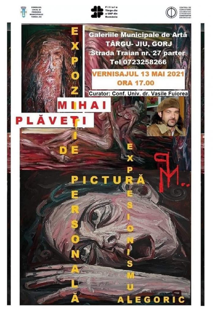 Filiala Târgu Jiu a Uniunii Artiștilor Plastici din România, în parteneriat cu Primăria Municipiului Târgu Jiu și Centrul de Cercetare, Documentare și Promovare “Constantin Brâncuși”, organizează joi, 13 mai 2021, ora 17.00, vernisajul expoziției personale de pictură “Expresionismul alegoric“, a artistului Mihai Plăveți. Vernisajul va avea loc la Galeriile Municipale de Artă din Târgu Jiu, strada Traian nr. 27, parter. Expoziția este deschisă publicului în perioada 13 Mai – 26 Mai 2021.