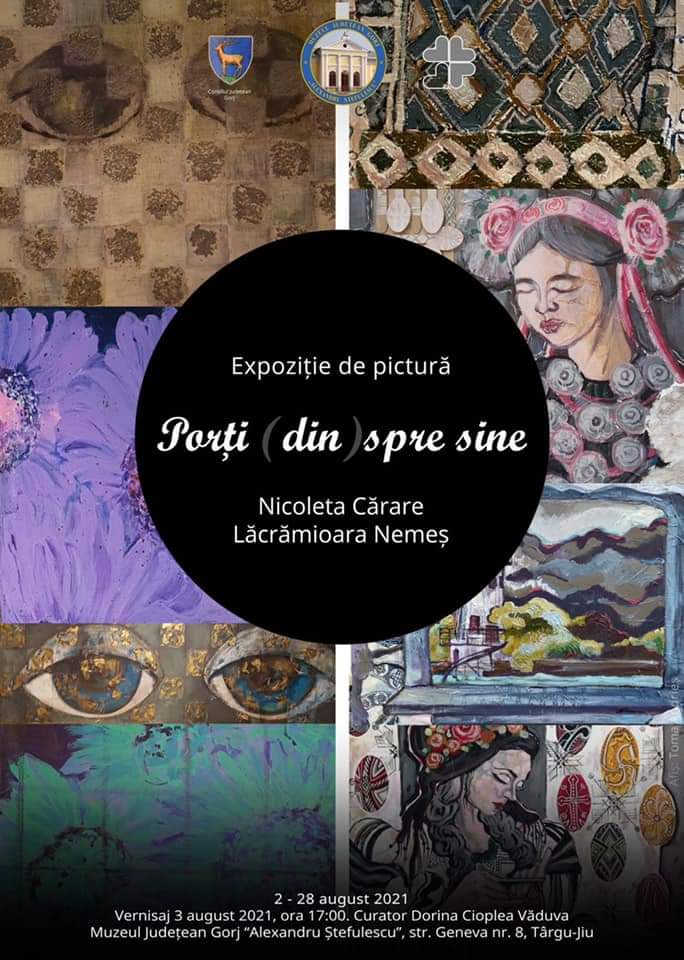 Marți, 3 august 2021, de la ora 17.00, la Muzeul Județean Gorj ”Alexandru Ștefulescu” din Târgu Jiu (str. Geneva, nr. 8), va avea loc vernisajul expoziției de pictură ”Porți (din)spre sine”. Expun artistele Nicoleta Cărare și Lăcrămioara Nemeș.