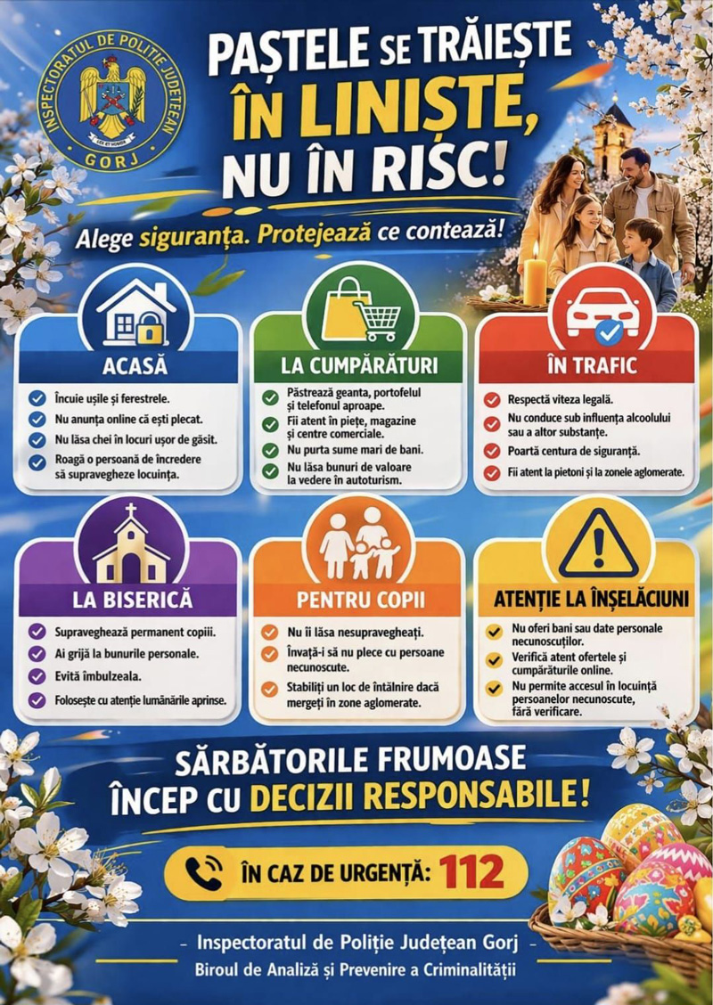 ,,În contextul în care, în aceste zile, se înregistrează o creștere a deplasărilor, a participării la slujbele religioase, a activităților comerciale și a prezenței în zonele aglomerate, este important ca fiecare persoană să acorde o atenție sporită siguranței personale, a familiei și a bunurilor. Pentru a preveni victimizarea, recomandăm siguranța locuinței, asigurați-vă că ușile și ferestrele locuinței sunt bine închise, chiar și atunci când plecați pentru perioade scurte. Nu lăsați chei de rezervă în locuri ușor de intuit! Dacă plecați de acasă pentru mai multe zile, rugați o persoană de încredere să supravegheze locuința. Evitați să anunțați public, pe rețelele de socializare, faptul că sunteți plecați de acasă. Nu permiteți accesul în locuință persoanelor necunoscute care pretind că reprezintă diferite instituții sau firme, fără a le verifica identitatea”, se precizează într-un comunicat al IPJ Gorj. Oamenii legii spun că la fel de importantă este și protejarea bunurilor personale. ,,În piețe, magazine, centre comerciale sau alte locuri aglomerate, păstrați geanta, portofelul, telefonul mobil și alte bunuri de valoare în locuri sigure. Nu purtați sume mari de bani asupra dumneavoastră, decât dacă este strict necesar. Fiți atenți la bunurile personale atunci când vă aflați la cumpărături sau în mijloacele de transport! Nu lăsați obiecte de valoare la vedere în autoturism!”, se mai precizează în comunicatul IPJ. În ceea ce privește siguranța în trafic, polițiștii susțin că, dacă plecați la drum, este important să verificați starea tehnică a autovehiculului înainte de deplasare, să respectați regimul legal de viteză și să adaptați viteza la condițiile de drum. ,,Nu conduceți sub influența alcoolului sau a altor substanțe interzise! Folosiți centura de siguranță și asigurați-vă că toți pasagerii fac același lucru! Acordați o atenție sporită pietonilor, în special în zonele aglomerate și în apropierea lăcașurilor de cult. În ceea ce privește participarea la slujbele religioase, atunci când mergeți la biserică, evitați să aveți asupra dumneavoastră sume mari de bani sau bunuri de valoare. Supravegheați cu atenție copiii și persoanele vârstnice care vă însoțesc. Evitați îmbulzeala și respectați indicațiile organizatorilor și ale forțelor de ordine. Dacă folosiți lumânări aprinse, manifestați prudență pentru a preveni producerea unor incendii sau accidente”, a declarat Ioana Nanu, purtătorul de cuvânt al IPJ Gorj. O altă recomandare este să nu lăsați copiii nesupravegheați în locuri aglomerate, la cumpărături sau în apropierea drumurilor publice. Pentru a evita situațiile neplăcute este necesar să stabiliți din timp un punct de întâlnire în cazul în care vă pierdeți unul de celălalt.