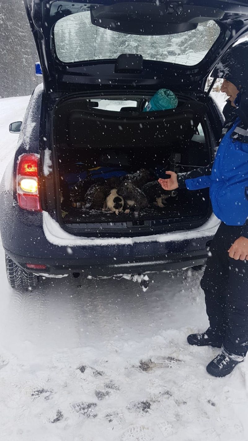 Un coleg a mers să vadă care este motivul agitației și a găsit mai mulți cățeluși împrăștiați în zăpadă pe o pantă. Fiind uzi, schincind de frig, jandarmii montani i-au urcat în mașină și au mers la sediul postului montan, cățeaua urmându-i după mașină. A fost improvizat într-o magazie un culcuș unde cei șase cățeluși vor sta. Ne implicăm pentru că ne pasă.