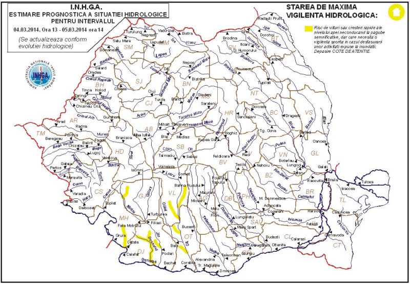 Începând din data de 04.03.2014, ora 13:00 pe unii afluenţi din bazinul mijlociu şi inferior al Jiului (judeţele Gorj şi Dolj) şi pe unii afluenţi ai Oltului inferior din judeţele Olt şi Vâlcea a fost instituit Cod Galben.