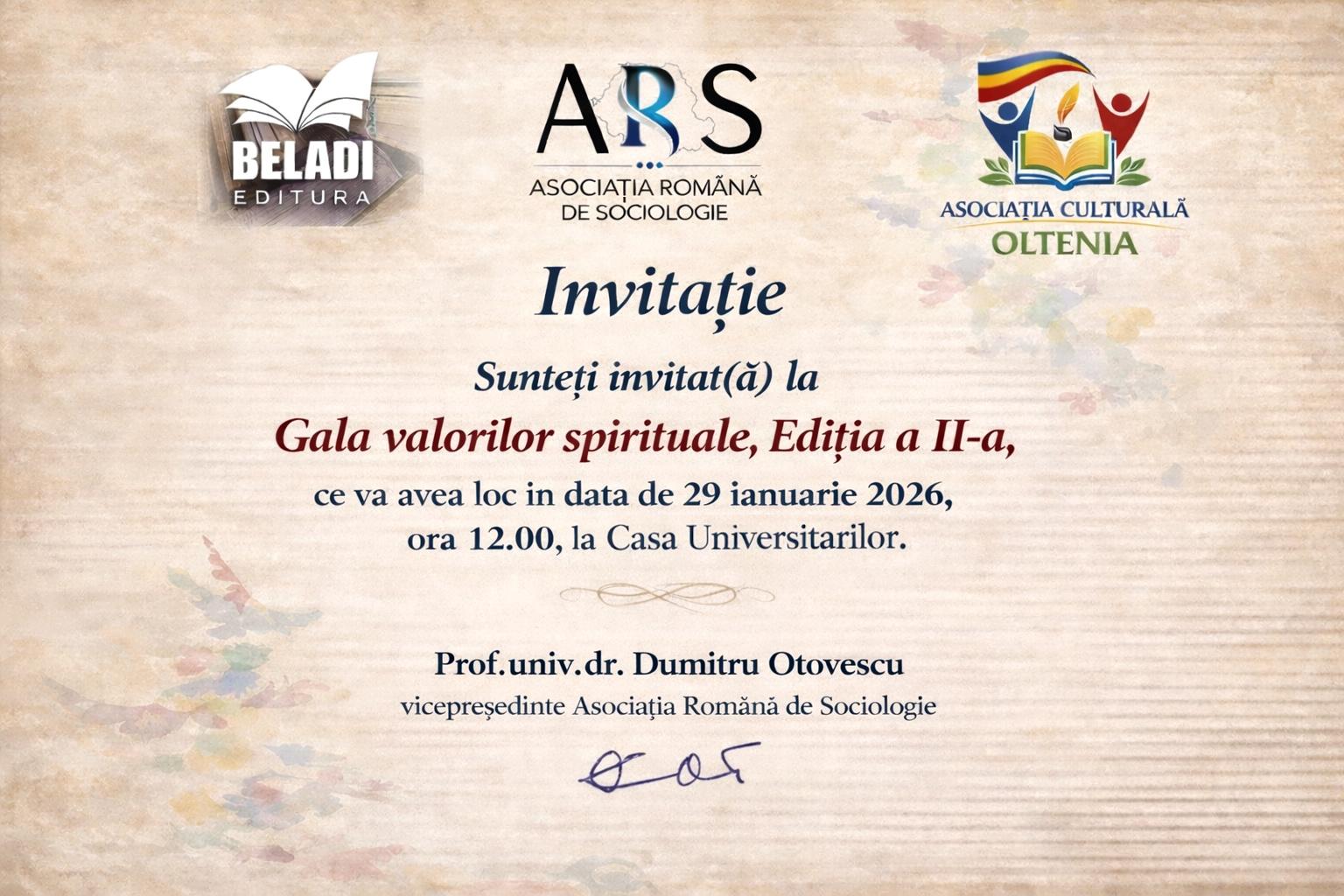 Sociologia este considerată ca fiind ştiinţa socială care studiază regulile sociale și procesele care leagă și de multe ori separă oamenii, nu numai ca indivizi, dar și ca membri ai asociațiilor, grupurilor și instituțiilor sociale, termenul ca atare aparţinând gânditorului francez Auguste Comte. Esenţa sociologiei constă în studiul vieții sociale umane, a grupurilor și a societăților, ca un demers ştiinţific de o mare cuprindere şi responsabilitate, întrucât subiectul ei este rezultatul propriului nostru comportament ca ființe sociale. Fiind un tratat de anvergură, sociologia poate fi definită ca studiul sistematic al societăților umane, punând accentul deosebit pe sistemele moderne şi postmoderne, digitalizate şi computerizate pentru a gestiona informaţia şi explozia informaţională! ,,Gândirea în termeni sociologici înseamnă a cultiva imaginația creatoare” (Dumitru Otovescu), mai ales că demersul sociologic depinde şi de ceea ce gânditorul american C. Wright Mills numea «imaginația sociologică», cu precizarea că unele dintre cele mai cunoscute metode de investigaţie ale sociologiei sunt: interviul, sondajul de opinie și observația socială. Pe un asemenea culoar ştiinţific de mare valoare ştiinţifică se situează şi Centrul de cercetări sociologice de la Craiova, având-l ca strălucit exponent pe domnul Prof. univ. dr. DUMITRU OTOVESCU, vicepreşedinte al Asociaţiei Române de Sociologie, autor a numeroase lucrări de specialitate care sunt appreciate în ţară şi în afara ţării! Tocmai de aceea, iubitorii de sociologie sunt invitaţi în ziua de joi, 29 ianuarie 2026, ora 12,00, la Casa Universitarilor din Craiova, la «Gala valorilor spirituale», Ediţia a II-a.