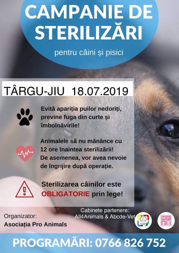 Joi, la Târgu Jiu, campanie gratuită de sterilizări pentru patrupede