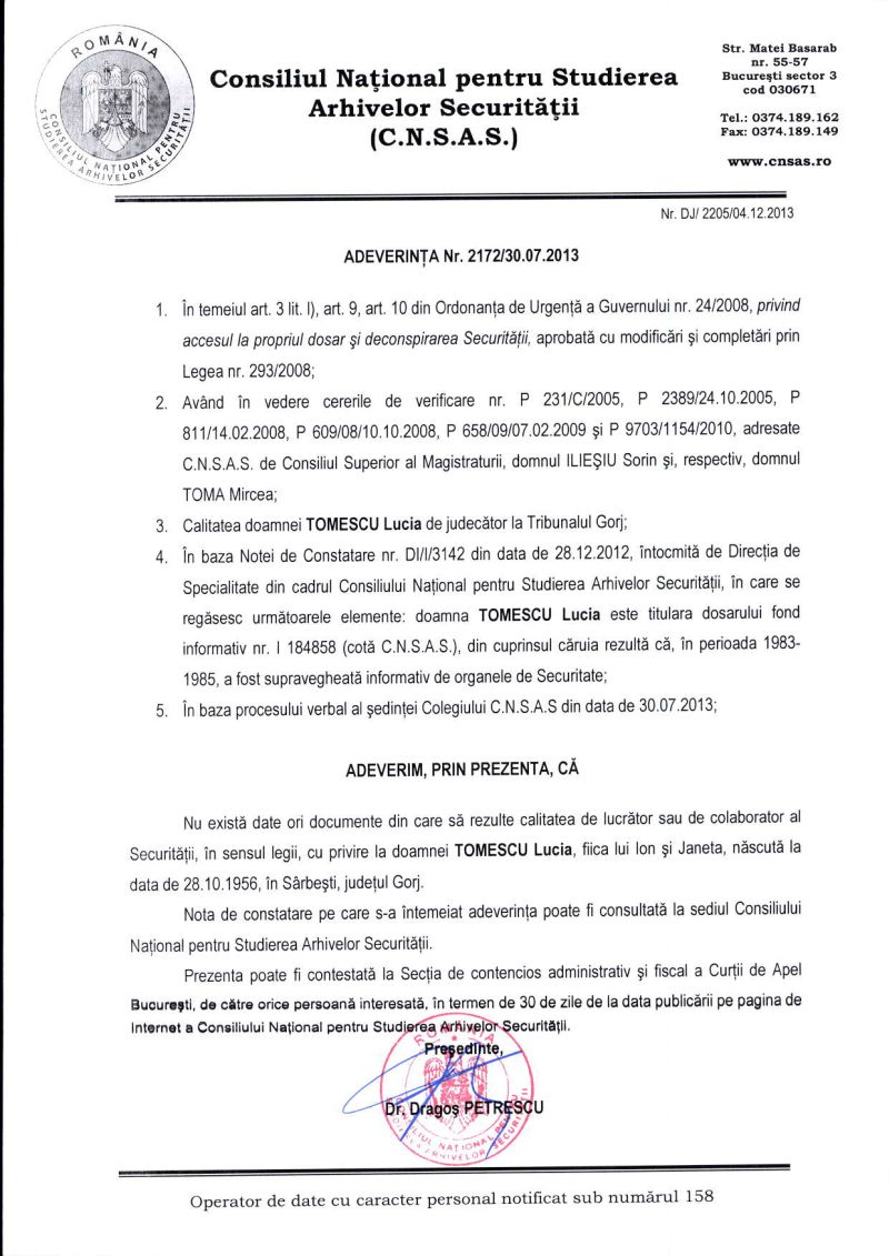 La cererea conducerii Consiliului Superior al Magistraturii, privind colaborarea procurorilor şi judecătorilor cu fosta Securitate, CNSAS a depistat că unul dintre magistraţii Tribunalului Gorj a fost ţinta acestui organ opresiv. Lucia Tomescu, magistrat al Tribunalului Gorj, s-a dovedit astfel că a fost titulara unui dosar “fond informativ nr. I 184858(cotă CNSAS) în cuprinsul căruia rezultă că în perioada anilor 1983-1985 a fost supravegheată informativ de organele de securitate). Interesant este că, deşi magistratul gorjean a fost verificat, la acest capitol, repetitiv între anii 2005-2009, abia în 2013 CNSAS a depistat că judecătoarea de 59 de ani a intrat în atenţia fostei Securităţi, care a urmărit-o timp de doi ani de zile.