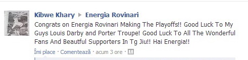 În postarea sa pe pagina suporterilor Energiei de pe un site de socializare, Kibwe Trim a ținut să felicite echipa pentru calificarea în play-off, să le ureze succes în continuare foștilor săi colegi, Porter Troupe și Louis Darby, dar și minunaților și frumoșilor suporteri târgujieni.