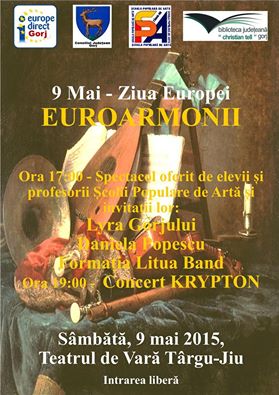 Evenimentul nostru se numeşte «Euroarmonii» şi este organizat în parteneriat cu Şcoala Populară de Artă, care va şi susţine, prin elevii şi profesorii săi, un program în cadrul căruia ne vor încânta cu muzică şi dansuri din diferite ţări europene. Avem şi invitaţi speciali – «Lyra Gorjului», Daniela Popescu şi Formaţia Litua Band. În final propunem târgujienilor întâlnirea cu formaţia Krypton. Evenimentul va avea loc pe 9 mai, la Teatrul de Vară din Târgu-Jiu. Intrarea este liberă şi aşteptăm câţi mai mulţi târgujieni să ni se alăture să sărbătorim împreună Ziua Europei”, a declarat Olimpia Bratu, managerul Bibliotecii Judeţene “Christian Tell”. Spectacolul oferit de elevii şi profesorii Şcolii Populare de Artă şi invitaţii lor va începe, la ora 17.00 şi va fi urmat, de la ora 19.00, de concertul formaţiei Krypton.
