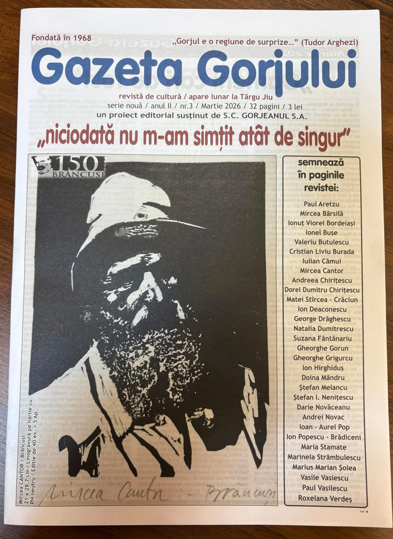 Vineri, 20 martie, începând cu ora 11:00, la Centrul Județean pentru Conservarea și Promovarea Culturii Tradiționale Gorj (C.J.C.P.C.T. Gorj) a fost lansată ediția de colecție a revistei culturale „Gazeta Gorjului” (nr. 3 din martie 2026), un număr special ce omagiază 150 de ani de la nașterea lui Constantin Brâncuși.