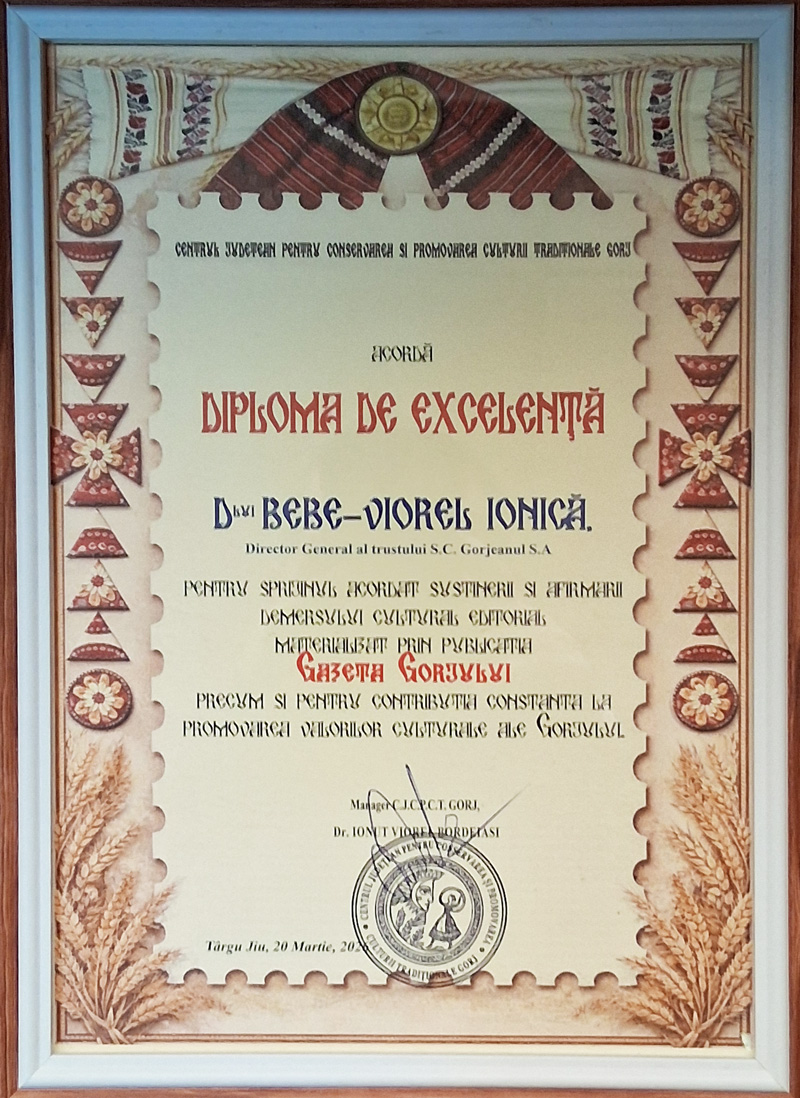 Domnul dr. Ionuț-Viorel BORDEIAȘI, a întărit spusele celor doi antevorbitori: „Practic ce să scrie astăzi este o modalitate de a lăsa urme peste timp. Poate că în ultima sută de ani este o inflație de scrieri, din toate punctele de vedere. Unele mai bune, altele mai puțin bune. Asta, până la urmă, istoria are ultimul cuvânt și timpul să le cearnă și discearnă, și să le arate valoarea”, menționând că și el scrie în paginile acestei reviste. Profitând de acest moment festiv, pentru că orice lansare „a ceva” este un moment festiv, a dăruit domnului Bebe-Viorel IONICĂ, din partea instituției, o Diplomă de Excelență cu următorul conținut: „C.J.C.P.C.T. Gorj acordă Diplomă de Excelență domnului Bebe-Viorel IONICĂ, Director General al trustului S.C. Gorjeanul S.A. pentru sprijinul acordat susținerii și afirmării demersului cultural-editorial materializat prin publicația Gazeta Gorjului, precum și pentru contribuția constantă la promovarea valorilor culturale ale Gorjului”. Domnul Ionuț-Viorel Bordeiași i-a mai dăruit și cele trei albume prezentate în română, franceză și engleză: „Brâncuși, calea spre lumină – între pământ și absolut”, „Gorj, acasă la Brâncuși” și „Meșteri și creatori populari din Gorjul lui Brâncuși”, realizate de instituția pe care o conduce, cu prilejul aniversării a 150 de ani de la nașterea marelui artist Constantin Brâncuși.