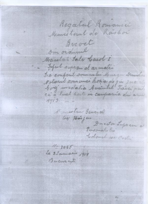 1. Participant în Campania din 1913, Brevet nr. 3065 (primit din partea) Majestăţii Sale Regele Carol I, din 3 ianuarie 1914.
