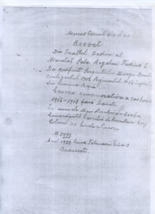 2. CRUCEA COMEMORATIVĂ a Războiului 1916-1918. În numele Majestăţii Sale Regele Ferdinand I. Sergentului MURGU D: DUMITRU. Brevet nr. 5478 din 8 februarie 1927”.
