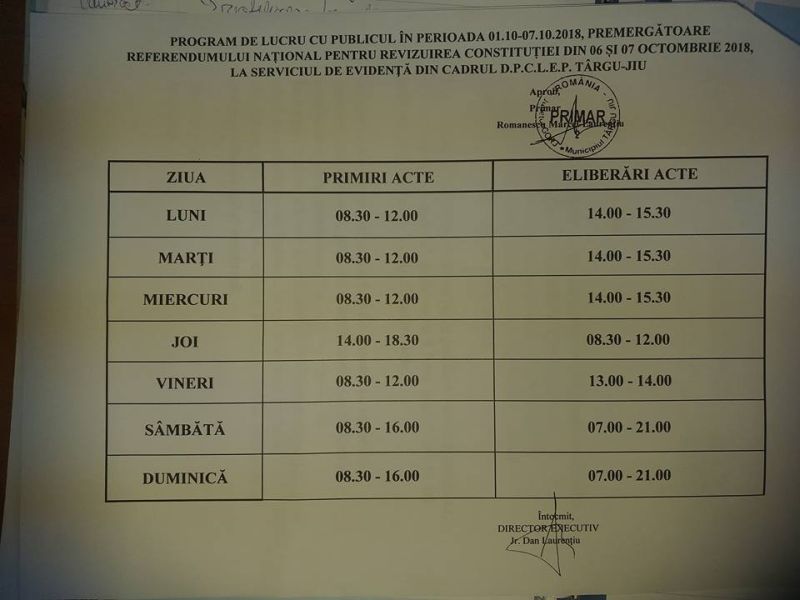 ”Primăria Municipiului Târgu-Jiu aduce la cunoștință cetățenilor faptul că, în perioada 1-7 octombrie, (premergătoare Referendumului Național pentru Revizuirea Constituției), programul de lucru al Serviciului de Evidență din cadrul DPCLEP Târgu-Jiu va fi următorul: 1-5 octombrie – programul de lucru cu publicul va fi cel obișnuit; 6-7 octombrie: programul de lucru va fi între orele 08.30-16.00 primire acte și 07.00-21.00, eliberare acte. Se vor lucra cu prioritate actele de identitate expirate, distruse, deteriorate, pierdute, dând astfel