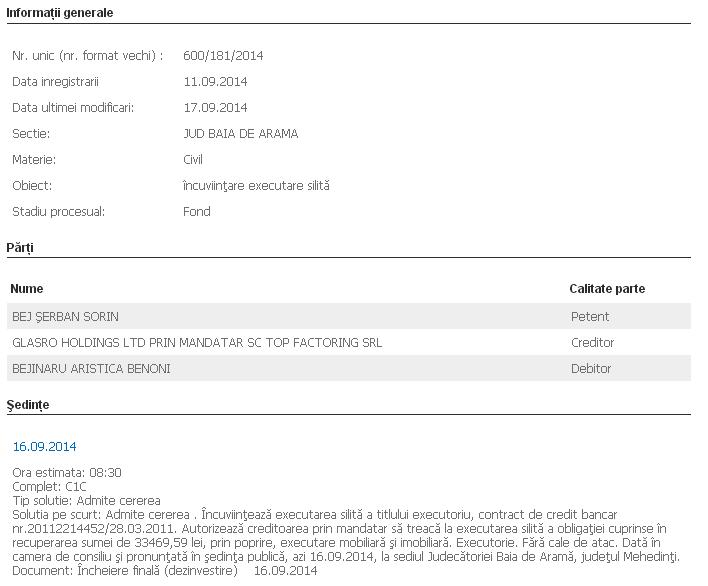 portalDin propriile fotografii postate cu generozitate pe o reţea de socializare, Bejinaru Benoni Aristică, lăcătuşul-mecanic de la UMC Roşiuţa care a fost reţinut în vară pe litoral, locul unde îşi înmulţea venitul, acesta părea că duce o viaţă de huzur. Deşi se poza însă în baruri sau pe schi-jet, şi avea un salariu sigur la cariera minieră, acasă, la Motru, proxenetul era plin de datorii. O dovedeşte procesul declanşat împotriva sa de o firmă de recuperare a datoriei, potrivit contractului de împrumut încheiat cu o bancă în anul 2011, care în septembrie 2014 a cerut încuviinţarea executării silite pentru debitorul Bejinaru, aflat în arest. După un singur termen, instanţa din judeţul vecin i-a dat creditorului, SC GLASRO HOLDINGS LTD, care a apelat la instanţă prin mandatar, adică prin SC TOP FACTORING SRL, câştig de cauză. “Încuviinţează executarea silită a titlului executoriu, contract de credit bancar nr.20112214452/28.03.2011. Autorizează creditarea prin mandatar să treacă la executarea silită a obligaţiei cuprinse în recuperarea sumei de 33.469,59 lei, prin poprire, executare mobiliară şi imobiliară”, se arată în sentinţa executorie şi fără cale de atac dată de Judecătoria Baia de Aramă.