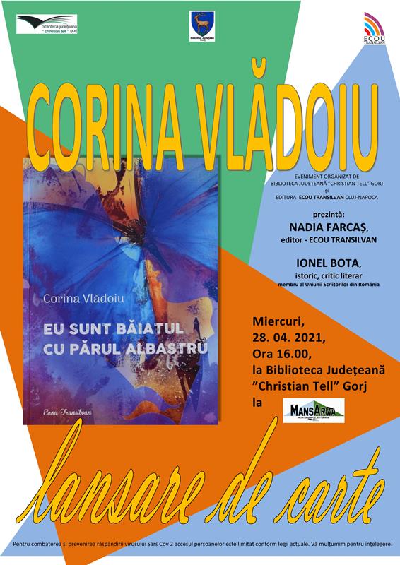 Miercuri, 28 aprilie, ora 16:00, la Biblioteca Județeană ”Christian Tell” Gorj va avea loc lansarea cărții ”Eu sunt băiatul cu părul albastru”, de Corina Vlădoiu. Prezintă: Nadia Farcaș (editor – Ecou Transilvan) și Ionel Bota (istoric, critic literar, membru al Uniunii Scriitorilor din România). Evenimentul este organizat de Biblioteca Județeană ”Christian Tell” Gorj și Editura Ecou Transilvan Cluj Napoca.