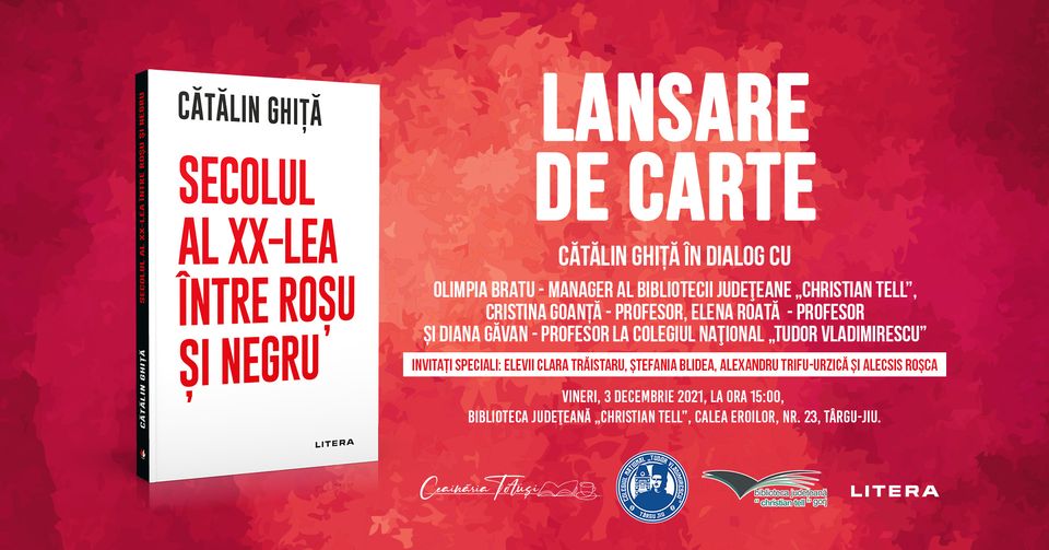Vineri, 03.12.2021, ora 15:00, la Biblioteca Județeană ”Christian Tell” Gorj va avea loc lansarea cărții „Secolul al XX-lea între roșu și negru”, de Cătălin Ghiță. În cadrul evenimentului, autorul va discuta cu Olimpia Bratu (manager al bibliotecii județene), Cristina Goanță, Elena Roată, Diana Găvan (profesori ai CNTV) și invitații speciali Clara Trăistaru (12G), Ștefania Blidea (12A), Alexandru Trifu-Urzică (12A), Alecsis Roșca (12G).
