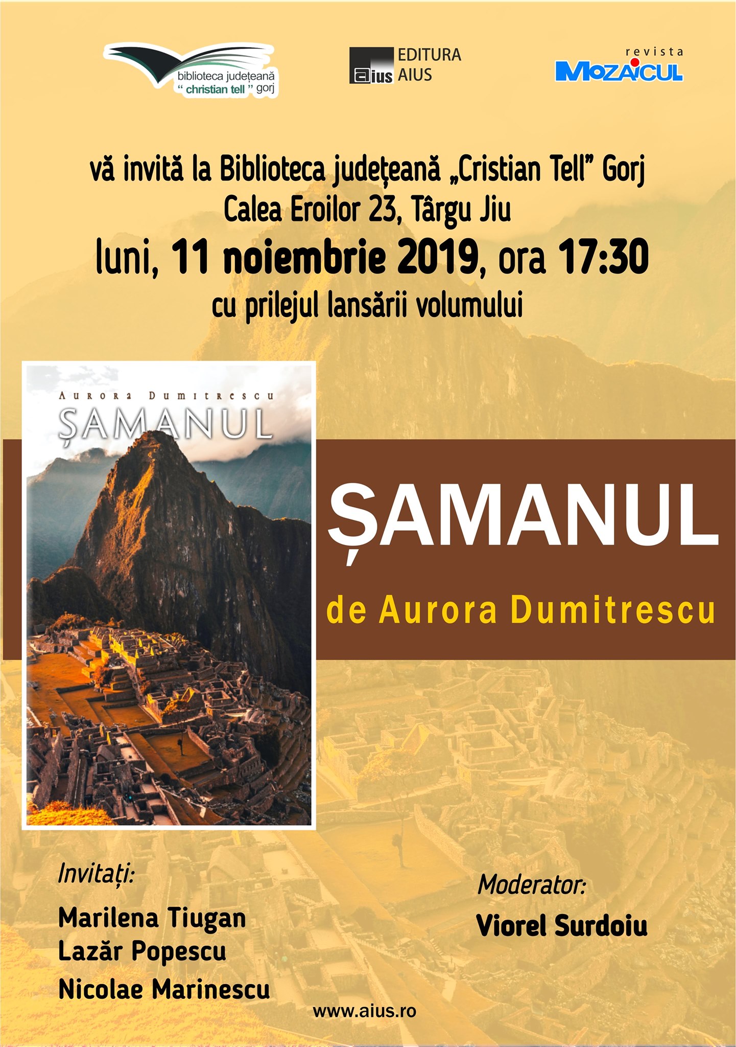 O nouă lansare de carte la Biblioteca Judeţeană „Christian Tell” din Târgu Jiu! Este vorba despre volumul „Şamanul” al scriitoarei Aurora Dumitrescu. Evenimentul va avea loc luni, 11 noiembrie, de la ora 17:30.