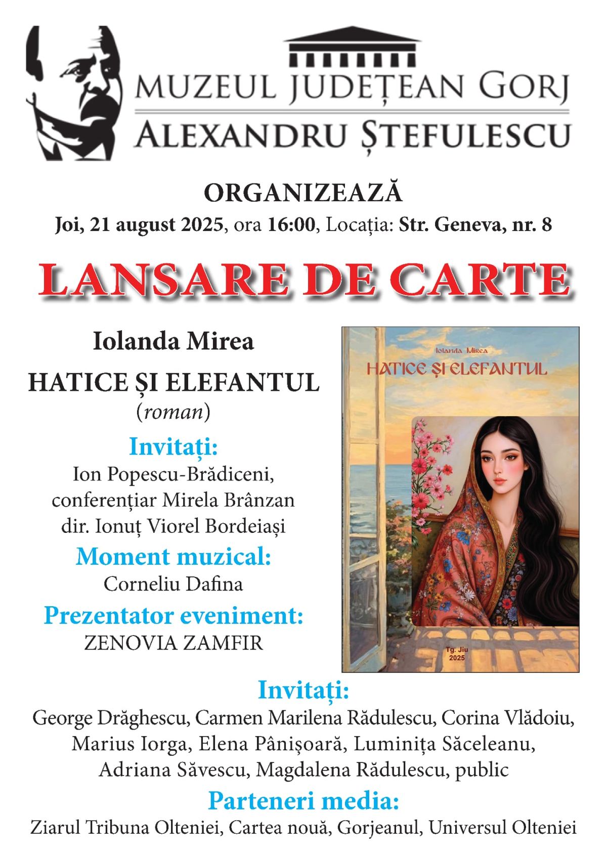 Joi, 21 august 2025, începând cu ora 16:00, la Muzeul Județean Gorj „Alexandru Ștefulescu” din Târgu Jiu, scriitoarea gorjeană Iolanda Mirea lansează noul său roman intitulat „Hatice și Elefantul”.