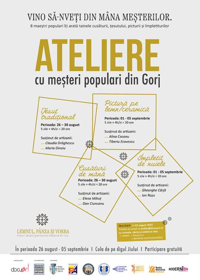 Fiecare atelier se desfășoară pe parcursul a cinci zile, timp de patru ore pe zi, totalizând 20 de ore de învățare practică. La final, o selecție din lucrările participanților va fi inclusă într-o expoziție dedicată Zilei Patrimoniului Imaterial, organizată în luna octombrie. „Meșteșugurile tradiționale sunt mai mult decât simple tehnici – sunt povești, răbdare, sens și identitate. Prin aceste ateliere, aducem împreună generații, punem în valoare memoria și amprenta locului și dăm un sens nou ideii de continuitate”, afirmă Daniela Apostol, coordonatoarea proiectului. Înscrierile sunt deschise până pe data de 22 august, printr-un email trimis la adresa: atelier@docuart.ro, care trebuie să conțină numele complet, vârsta și atelierul ales. Proiectul este cofinanțat de Administrația Fondului Cultural Național (AFCN) și realizat în parteneriat cu Primăria Municipiului Târgu Jiu, Centrul de Cercetare, Documentare și Promovare „Constantin Brâncuși”, Școala Populară de Arte „Constantin Brâncuși”, Liceul de Arte „Constantin Brăiloiu” și Muzeul Județean Gorj „Alexandru Ștefulescu”.