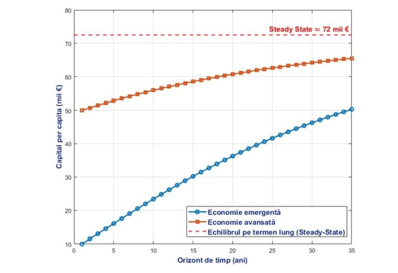 Pentru a reda cât mai bine procesul de convergență am recurs la parametrizarea modelului Solow pentru cazul unei economii avansate, respectiv al unei economii emergente aflate într-un proces de convergență. În cadrul acestui exercițiu contrafactual cantitativ am considerat o calibrare relativ standard, unde rata de depreciere a capitalului este de 5% pe an, rata de economisire este de 20%, în timp ce ponderea capitalului în venitul total din economie este 30%. În cadrul exercițiului, cele două tipuri de economii se deosebesc prin nivelul inițial al capitalului pe locuitor. Astfel, pentru economia emergentă am considerat un nivel al capitalului pe locuitor de 5 mii de euro, în timp ce pentru economia avansată, nivelul capitalului pe locuitor a fost calibrat la 10 mii de euro. Întrucât rata de depreciere a capitalului, rata de economisire, respectiv ponderea capitalului în venitul total din economie sunt aceleași pentru ambele tipuri de economii, rezultă un nivel de echilibru pe termen lung al capitalului pe locuitor de 72 mii de euro. Pentru analiza de față am considerat un orizont de timp de 35 de ani.