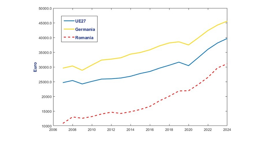 Pentru a ilustra evoluția convergenței în cadrul UE, am prezentat mai jos evoluția PIB pe locuitor la paritatea puterii de cumpărare, atât ca medie la nivelul Uniunii, cât și pentru Germania (ca proxy pentru zona euro) și pentru România.
