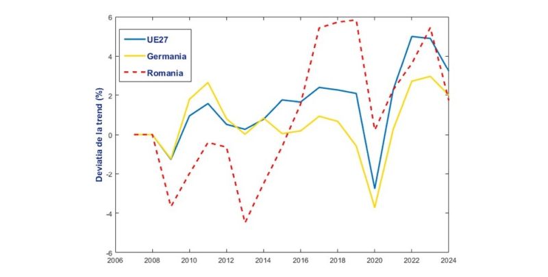 Din Figura 3, se poate observa o volatilitate mai ridicată în cazul țării noastre comparativ cu cazul Germaniei sau al Uniunii Europene. De asemenea, variațiile componentei ciclice în cazul Germaniei arată o magnitudine mai redusă decât în cazul Uniunii Europene, ceea ce este firesc, deoarece media raportată la nivelul UE reflectă atât evoluții mai volatile aferente statelor membre cu economie emergentă, cât și pe cele mai stabile aferente economiilor mari și mult mai dezvoltate.