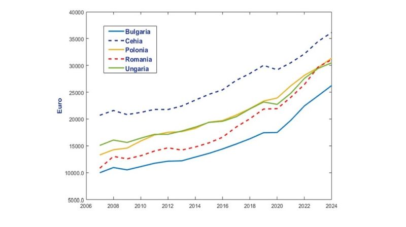 Pentru Europa Centrală și de Est, evoluțiile evidențiate în Figura 4 subliniază faptul că România a avut una dintre cele mai accelerate și mai susținute dinamici ale PIB pe locuitor din regiune. La momentul aderării la Uniunea Europeană, în ceea ce privește acest indicator, țara noastră se plasa la un nivel superior doar Bulgariei. Totodată, PIB-ul pe locuitor al Ungariei era superior celui al României și al Poloniei. Circa 18 ani mai târziu, în 2024, PIB-ul pe locuitor al României era foarte apropiat de cel al Poloniei și superior celui aferent Ungariei.