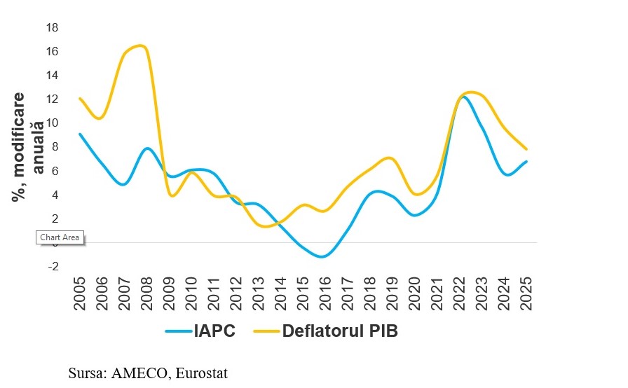 În figura de mai jos regăsim modificarea anuală a indicelui armonizat al prețurilor de consum sau a ratei inflației (conform statisticilor Eurostat, se raportează media anuală a indicelui IAPC lunar, deci modificarea acestuia reprezintă rata medie anuală a inflației), respectiv cea a deflatorului PIB. După cum se poate observa dintr-o simplă inspecție vizuală, dinamica anuală pentru cei doi indici a fost foarte apropiată în anumite perioade de timp, dar au existat și perioade caracterizate de decuplare semnificativă. Corelația dintre modificarea anuală a IAPC și cea a deflatorului PIB pentru perioada 2005-2025 este de aproximativ 72,3%, prin urmare una relativ ridicată. Observăm faptul că în perioada anterioară crizei financiare din 2008-2009, dinamica anuală a deflatorului PIB a fost sistematic și semnificativ peste cea a IAPC. Dacă ne uităm la perioada post-criză, adică perioada 2012-2025, corelația dintre cele două dinamici crește la aproximativ 85,4%. Pe de altă parte, dacă excludem perioada de după izbucnirea crizei pandemice și luăm în considerare perioada 2012-2019, corelația dintre variația anuală a IAPC și deflatorul PIB scade la aproximativ 67,1%. Prin urmare, legătura dintre variația anuală a IAPC și deflatorul PIB depinde de elemente precum fazele ciclurilor economice și financiare, natura șocurilor care afectează economia în ansamblu sau diferite măsuri în materie de politică monetară și fiscală. O variație anuală a deflatorului PIB peste cea a IAPC se traduce prin faptul că prețurile din întreaga economie cresc mai rapid decât cele din coșul de consum.