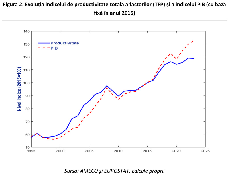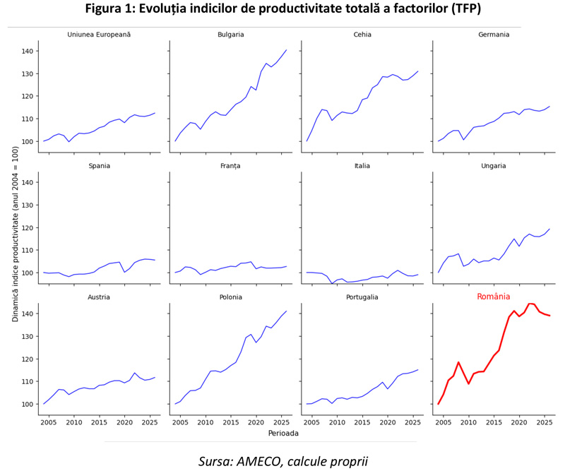 Analiza datelor privind productivitatea totală a factorilor (TFP) obținute din baza de date AMECO a Direcției Generale pentru Afaceri Economice și Financiare a Comisiei Europene arată că România a avut într-adevăr, pe termen mediu, una dintre cele mai accelerate dinamici comparativ cu țările din zonă. De exemplu, cifrele estimate pentru 2024 indică pe ansamblul ultimilor 10 ani o creștere a productivității totale a factorilor de circa 19,5% în România, 18,1% în Polonia, 12,1% în Cehia și 10,2% în Ungaria. Aceleași estimări arată însă, în cazul României (dar și al Ungariei), că productivitatea totală a factorilor și-a întrerupt tendința de creștere în ultimii doi ani (2023 și 2024) și că această situație s-ar putea prelungi în 2025 și 2026 pe fondul unor șocuri suprapuse (empiric se poate observa faptul că șocurile puternice resimțite după izbucnirea crizei financiare din 2008-2009 au determinat o inversare temporară a trendului productivității totale a factorilor).