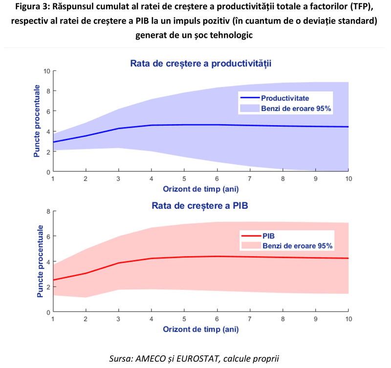 O altă perspectivă în sensul celor investigate anterior este să privim direct la cauzalitatea existentă între rata de creștere a productivității (TFP) și creșterea PIB. Mai exact, este analizat modul în care un impuls pozitiv asupra ratei de creștere a productivității (determinat de un șoc tehnologic neanticipat) impactează creșterea economică. În acest sens a fost folosit un model structural de vectori auto-regresivi, SVAR, iar răspunsurile celor două variabile la un șoc tehnologic au fost obținute utilizând restricții contemporane conform cărora șocurile non-tehnologice asupra creșterii economice nu afectează pe termen scurt productivitatea totală a factorilor. Această abordare este inspirată de viziunea lui Galí (1999), de separare a șocurilor tehnologice de cele non-tehnologice într-un model SVAR, fiind totodată în linie cu viziunea modelelor de tip Real Business Cycle, conform cărora progresul tehnologic este pe deplin exogen pe termen scurt. În figura de mai sus observăm faptul că, după un impact inițial de 2,91 puncte procentuale, răspunsul cumulat al ratei de creștere a productivității este de 4,43 puncte procentuale pe un orizont de zece ani. Pe de altă parte, rata de creștere a PIB arată un răspuns inițial de 2,51 puncte procentuale, în timp ce răspunsul cumulat pe orizontul investigat este de 4,24 puncte procentuale. După cum menționam mai devreme, în literatura și practica de specialitate, progresul tehnologic poate fi perceput drept un multiplicator neutral. În cazul de față, pe baza rezultatelor prezentate putem afirma că un impuls pozitiv asupra ratei de creștere a productivității se transmite inițial într-o proporție de 86% asupra evoluției ratei de creștere economică, iar efectul cumulat pe un orizont de timp de zece ani ajunge până la o proporție de 96%. Această abordare a fost inspirată de viziunea lui Blanchard și Perotti (2002), de calculare a multiplicatorilor fiscali într-un model SVAR.