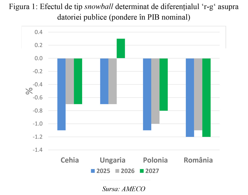 În graficul de mai sus, se poate observa efectul de tip snowball determinat de diferențialul ‘r-g‘ asupra datoriei publice. Valorile negative din grafic indică faptul că diferențialul ‘r-g‘ are efecte de scădere asupra datoriei publice, în timp ce valorile pozitive indică efecte de creștere asupra datoriei publice. Din grafic se poate observa că diferențialul ‘r-g‘ are efecte mai favorabile asupra datoriei publice în cazul țării noastre comparativ cu celelalte țări din regiune, atât pentru anul 2025, cât și pentru următorii doi ani (aceste efecte se reflectă implicit și asupra spațiului fiscal).