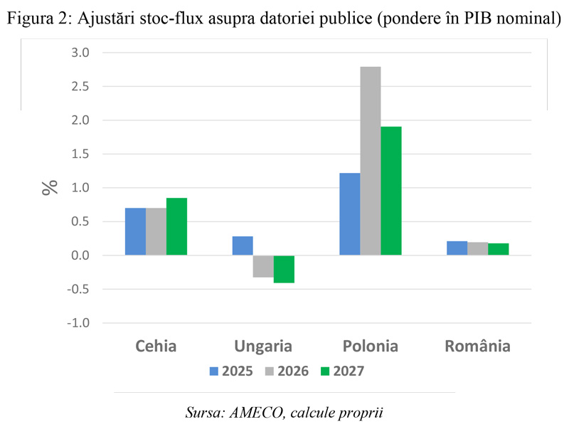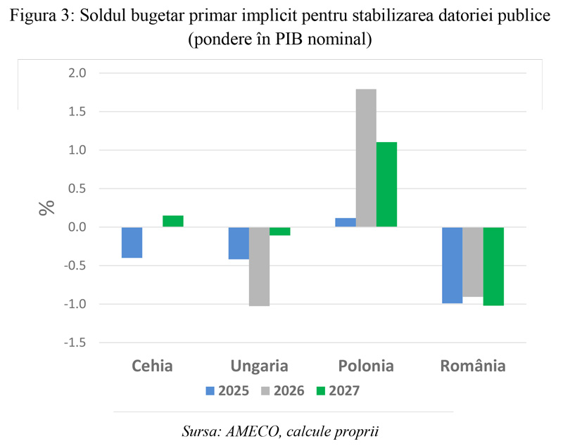 În schimb, în opoziție cu rezultatele calculelor de mai sus disponibile în baza de date AMECO, deficitele bugetare primare prognozate pentru 2026-2027 depășesc semnificativ nivelul de 1% în cazul țării noastre. În cazul Poloniei, pentru care ar fi trebuit să existe excedente bugetare primare în vederea stabilizării datoriei publice pentru 2026 și 2027, se așteaptă deficite bugetare primare în următorii doi ani chiar mai mari decât ale României, ceea ce va determina, și pentru această țară, o creștere semnificativă a datoriei publice. În cazul Ungariei, deficitele bugetare primare sunt puțin peste 1%, în timp ce în cazul Cehiei se așteaptă ca deficitele bugetare primare să fie sub 1%.