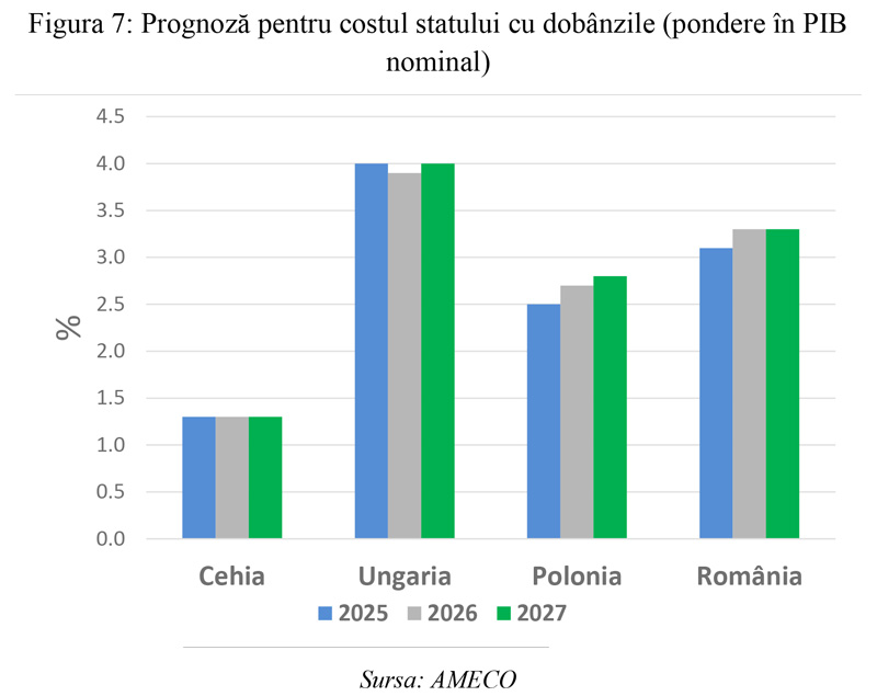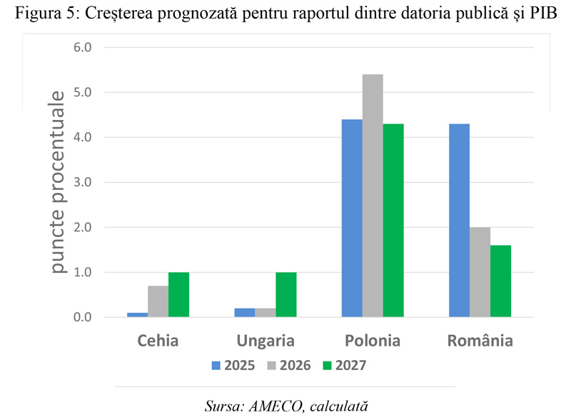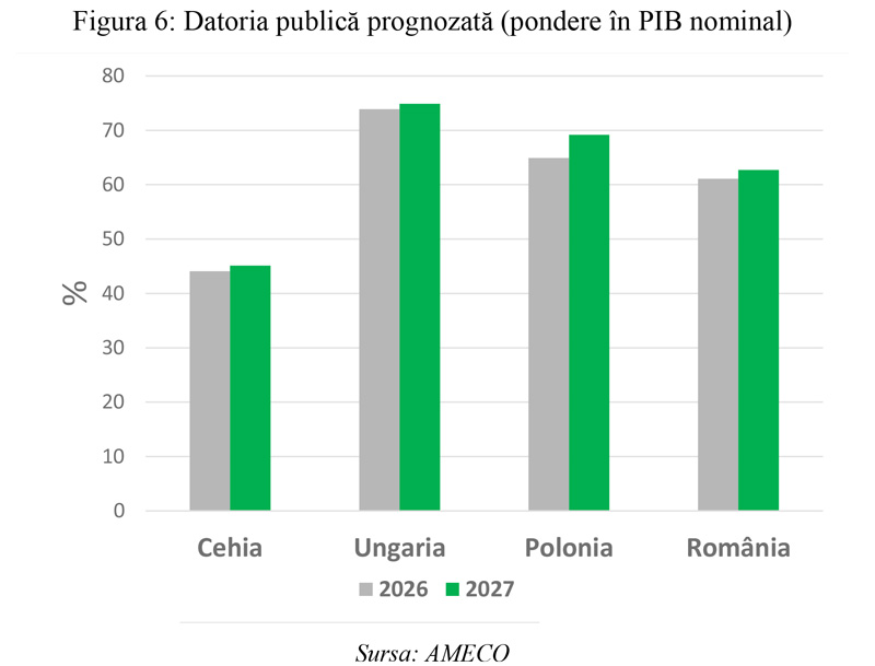 Date fiind circumstanțele menționate anterior, pentru România, se așteaptă o creștere a raportului datorie publică / PIB de 2 și, respectiv, 1,6 puncte procentuale în anii 2026 și 2027, în timp ce pentru Cehia și Ungaria, creșterile așteptate sunt de până la 1 punct procentual. O notă distinctă se remarcă în cazul Poloniei, pentru care, în următorii doi ani, se așteaptă creșteri ale acestui indicator de 5,4 puncte procentuale, respectiv 4,3 puncte procentuale.