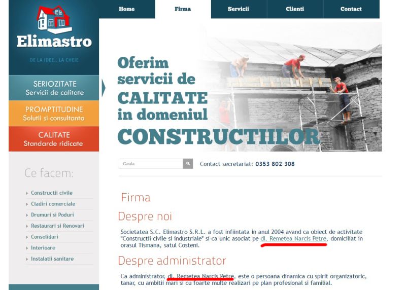 Viceprimarul ALDE din comuna vecină Padeșului, Petre Remetea, a renunțat, în acte la afaceri, după ce a devenit, în 2016, ales local la Tismana. Afaceristul, deținător al SC ELIMASTRO SRL cu sediul în Târgu-Jiu, a pasat însă cârma firmei în cauză soției sale, Corina Remetea, până atunci responsabil cu deșeurile societății, care din vara anului trecut a devenit, de nevoie, specialistă în construcții. Spunem asta deși pe site-ul societății în cauză figurează încă anunțul potrivit căruia “S.C. Elimastro S.R.L. a fost înființată în anul 2004 având ca obiect de activitate «Construcții civile și industriale» și ca unic asociat pe dl. Remetea Narcis Petre, domiciliat în orașul Tismana, satul Costeni”. Tot pe site-ul Elimastro este lăudat viceprimarul de Tismana astfel: “Ca administrator, dl. Remetea Narcis Petre, este o persoană dinamică cu spirit organizatoric, tânăr, cu ambiții mari și cu foarte multe realizări pe plan profesional și familial”.