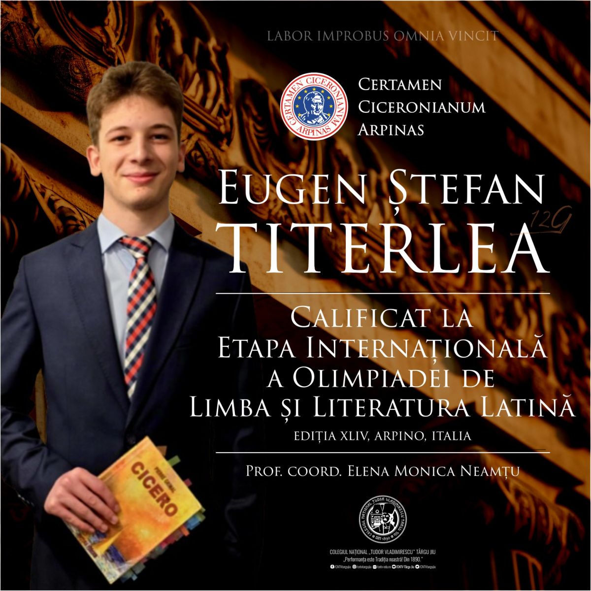 Eugen Ștefan Titerlea, elev în clasa a XII-a la Colegiul Național „Tudor Vladimirescu” din Târgu Jiu, a obținut o performanță deosebită, reușind să se califice la Olimpiadă Internațională de limba și literatura latină „Certamen Ciceronianum Arpinas”, ediția a XLIV-a.