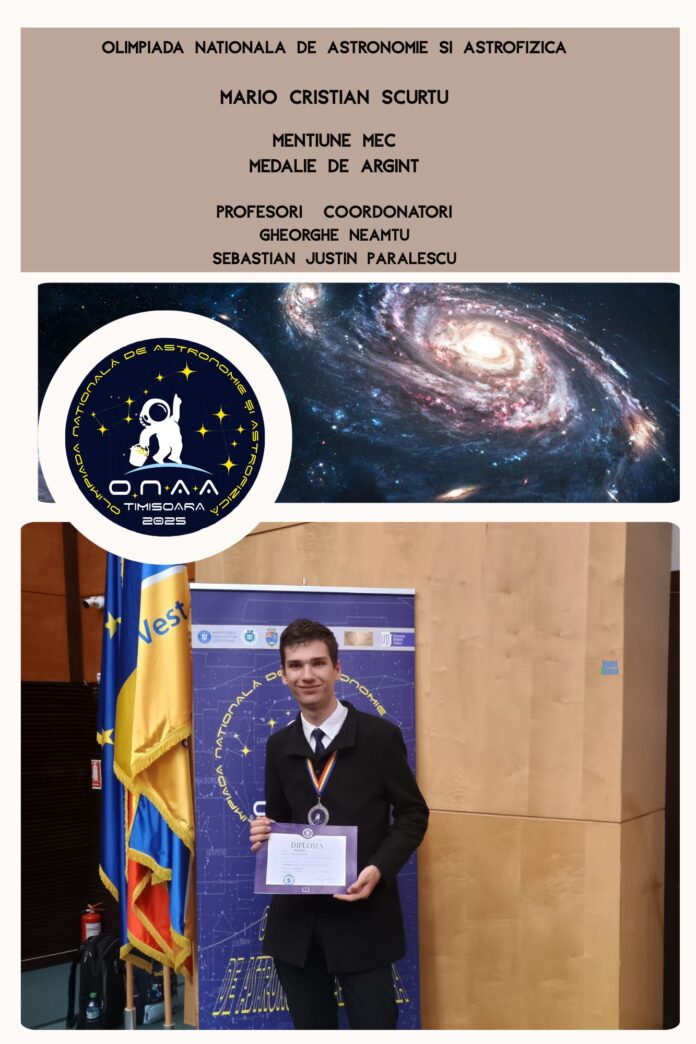 Tânărul a obținut recent medalia de argint și o mențiune din partea Ministerului Educației la Olimpiada Națională de Astronomie și Astrofizică, desfășurată la Timișoara.
