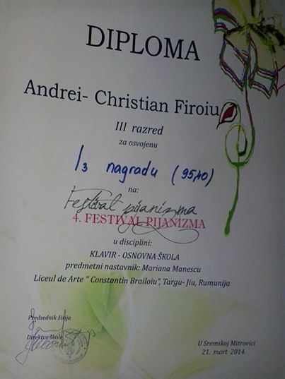 La concursul internațional de pian de la Sremska Mitrovica din Serbia, desfășurat între 20-23 martie 2014 a participat un lot de cinci elevi ai Liceului de Arte ”Constantin Brăiloiu” din Tg-Jiu, care s-au întors victorioși acasă.