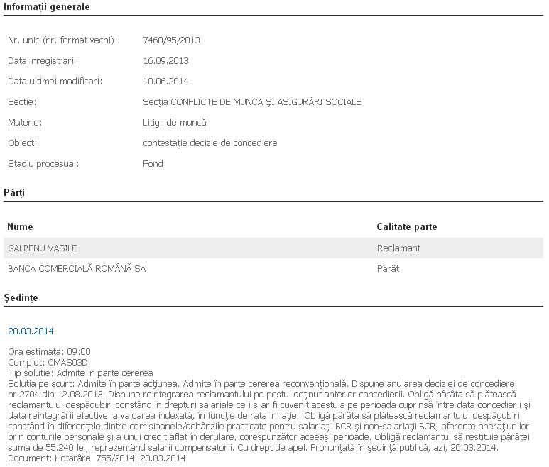 BCR a pierdut pe fond ambele procese intentate de cei doi lideri sindicali de la Gorj care fuseseră concediaţi în cadrul procesului de restructurare derulat anul trecut de instituţia bancară. Vasile Galbenu şi Nicolae Vasile nu au stat pe gânduri şi au reacţionat dorind să-şi facă dreptate la instanţă, ambii reclamând că disponibilizarea lor nu a respectat legislaţia în vigoare. Deşi acţiunea lui Galbenu este înregistrată în septembrie, abia în ianuarie a acestui an a început efectiv procesul, care s-a terminat însă, la instanţa de fond, pe 20 martie. La fel se întâmplă şi cu colegul acestuia de sindicat, care primeşte o sentinţă favorabilă în aceeaşi zi. Tribunalul Gorj a decis astfel ca atât Vasile Galbenu, cât şi Nicolae Vasile, să fie reintegraţi pe posturile pe care le-au deţinut înainte să fie concediaţi.