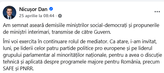 „Îmi voi exercita în continuare rolul de mediator. Ca atare, i-am invitat, luni, pe liderii celor patru partide politice pro-europene şi pe liderul grupului parlamentar al minorităţilor naţionale, pentru a avea o discuţie tehnică şi aplicată despre programele majore pentru România, precum SAFE şi PNRR”, a menţionat preşedintele Nicuşor Dan, sâmbătă, într-o postare pe Facebook.