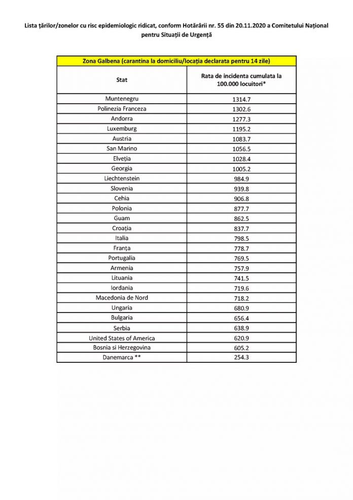 Lista țărilor/zonelor cu risc epidemiologic ridicat, conform Hotărârii nr. 55 din 20.11.2020 a Comitetului Național pentru Situații de Urgență.