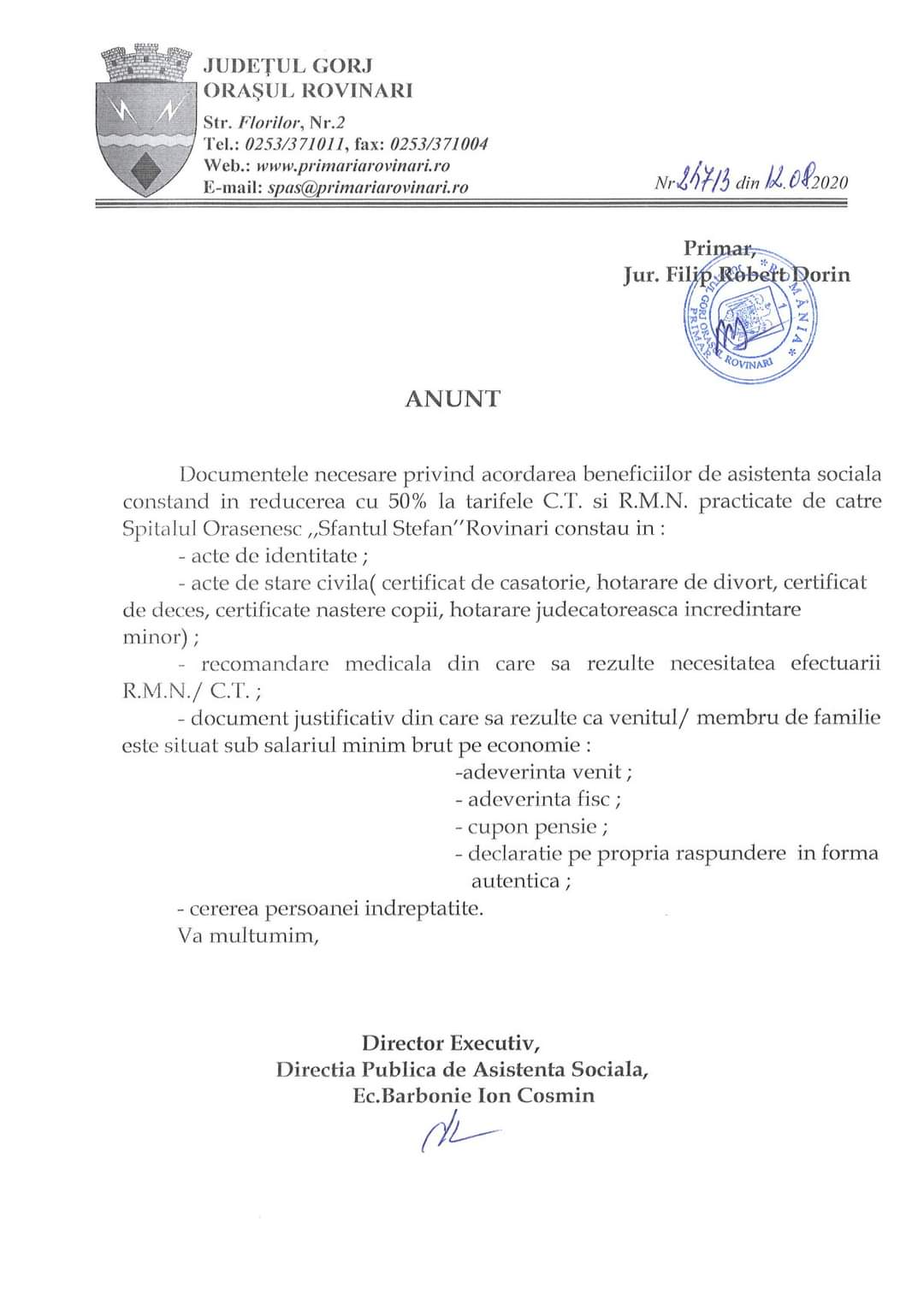 A fost stabiltă lista cu documentele necesare acordării reducerii de 50% la tarifele pentru Computer Tomograf și R.M.N practicate de către Spitalul orășenesc „Sfântul Ștefan” Rovinari.