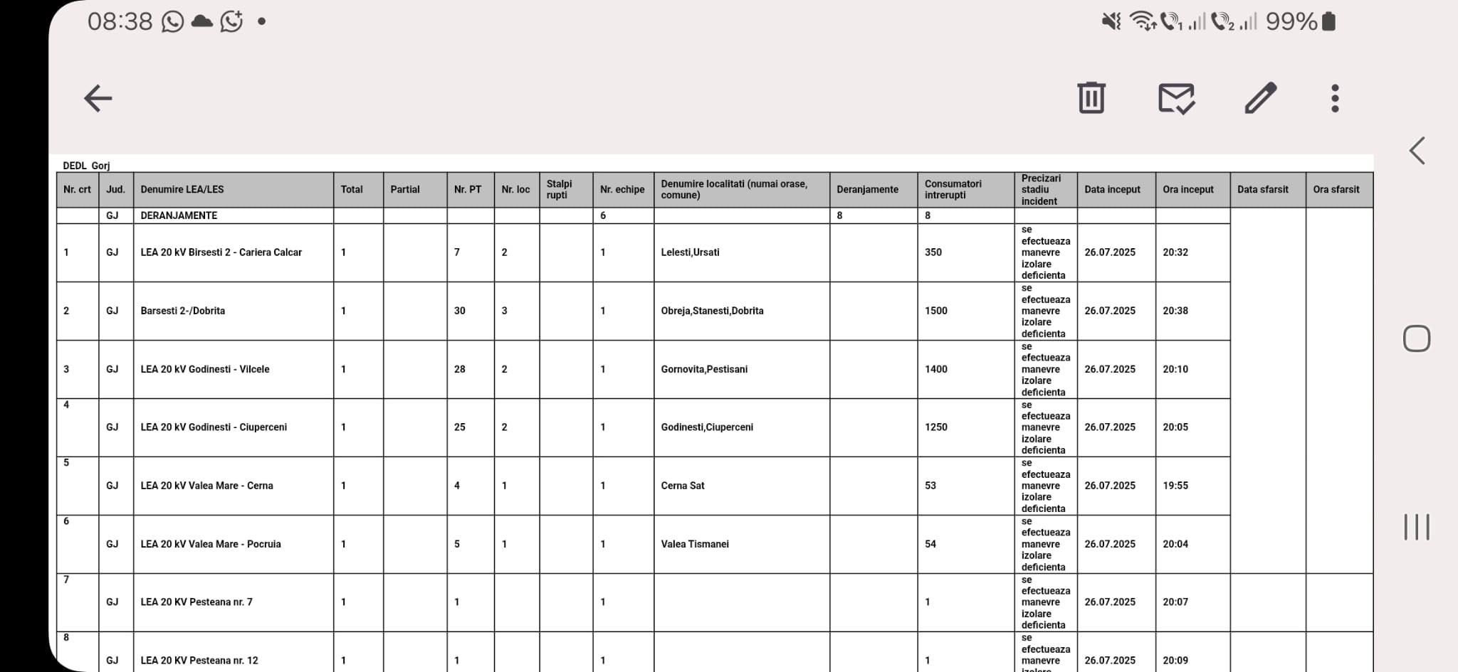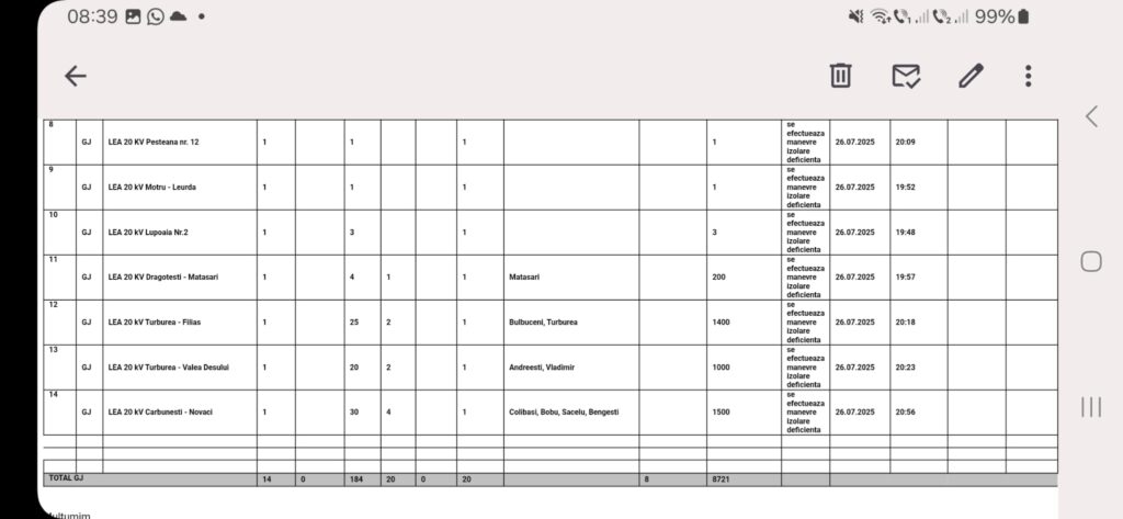 Urmare a fenomenelor meteo (vijelii, intensificări ale vântului) înregistrate în seara zilei de 26.07.2025, pe raza județului Gorj, au fost sesizate 14 întreruperi ale energiei electrice, în mai multe localități. În prezent se lucrează intens pentru reparații rețele în zona Târgu Jiu, cu 8 echipe, în zona Motru și Rovinari, cu 3 echipe, în zona Târgu Cărbunești se lucrează cu 4 echipe. În plus, de lucrează cu echipe suplimentare de la o firma prestatoare de servicii, arată Prefectura Gorj într-un comunicat de presă.